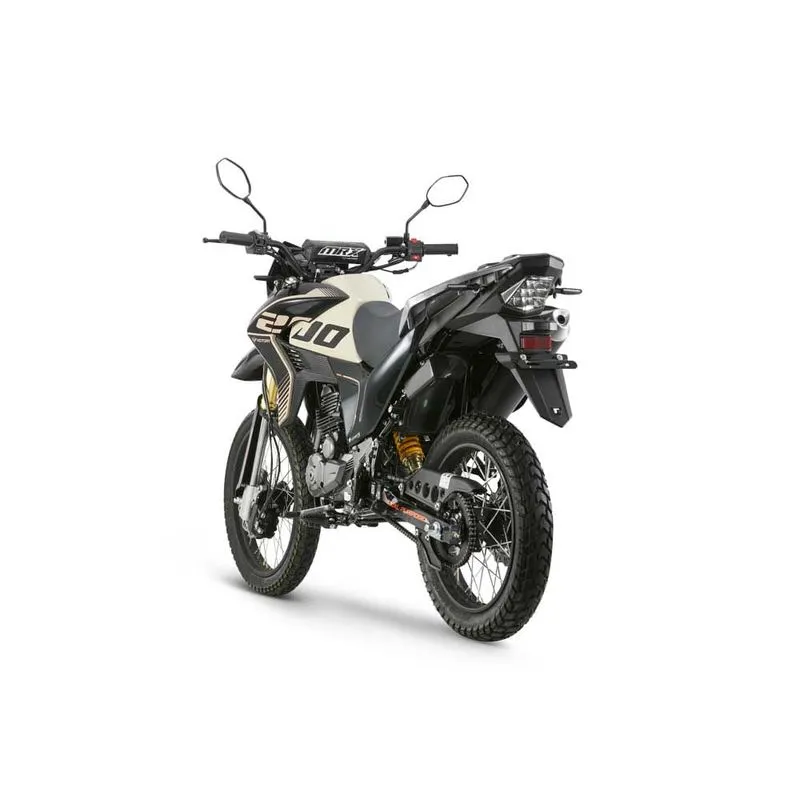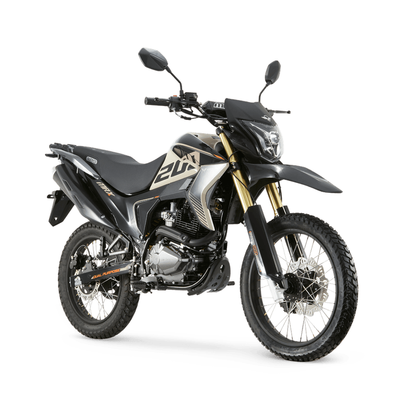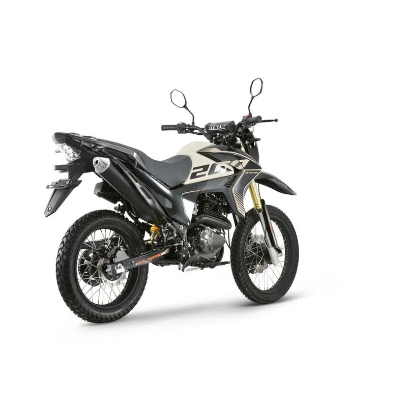 La moto MRX 200 está diseñada para personas apasionadas por la aventura, que quieran sobrepasar los límites de lo común desbloqueando nuevos horizontes en una motocicleta en la que tenga la ventaja en cualquier terreno y recorrido que desee realizar. Le estamos hablando a moteros que quieren desbloquear el siguiente nivel, siendo conscientes que van a resaltar en cualquier lugar con una máquina que expresa lo mejor del significado TODO TERRENO en un vehículo. Con su potente motor Mono cilíndrico 4 tiempos SOHC, podrás desafiar cualquier terreno.